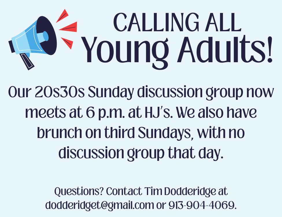 Our Sunday discussion group has a new meeting time—join us at 6 p.m. on Sundays at HJ’s (instead of after the 10:15 a.m. service). We’ll continue to gather for brunch on the third Sunday of each month following the 10:15 service, and we won’t meet for discussion group on those Sundays.