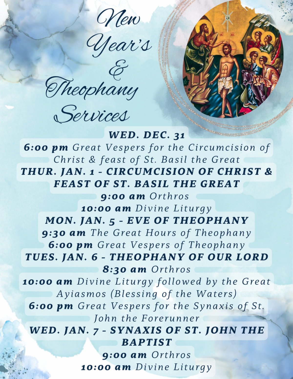 | | NEW YEAR'S DAY & THEOPHANY CHURCH SERVICES | | NOTE: The Church Office will be closed during weekday church services and all-day on Tuesday, January 6th in observance of the Theophany of our Lord. | | 2026 ANNUAL MEMBERSHIP CAMPAIGN | | Parish Membership - Every year, we seek your support and renewed commitment to help ensure that we are meeting our parish’s growing time, talent & treasure needs. We are also required by the Archdiocese Regulations to have all members of the Parish renew their membership each year to remain in “good standing.” | | |
