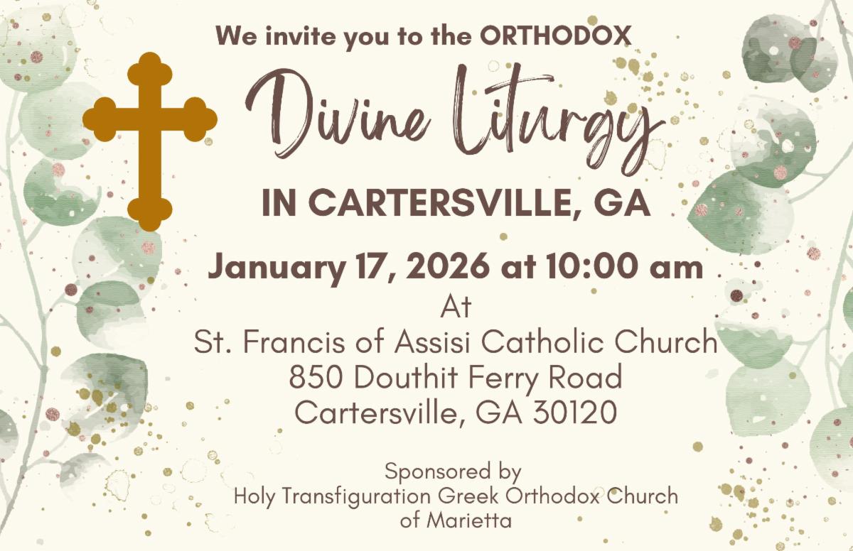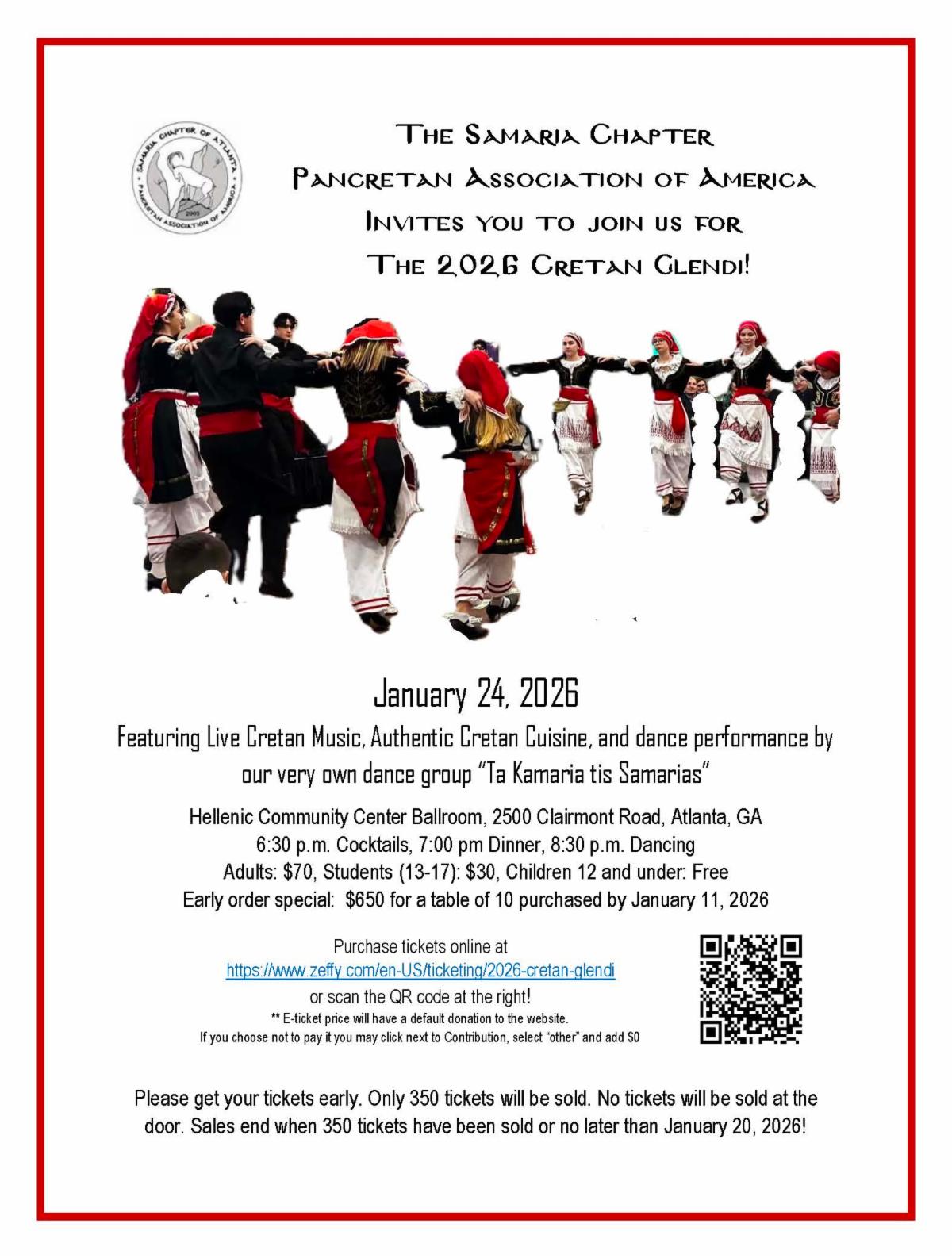 | | COLLEGE CHRISTMAS GATHERING: JAN. 4 | | CARTERSVILLE ORTHODOX MISSION: DIVINE LITURGY ON JAN. 17 | | SAMARIA CHAPTER OF THE PANCRETAN ASSOCIATION OF AMERICA'S ANNUAL CRETAN GLENDI: JAN. 24