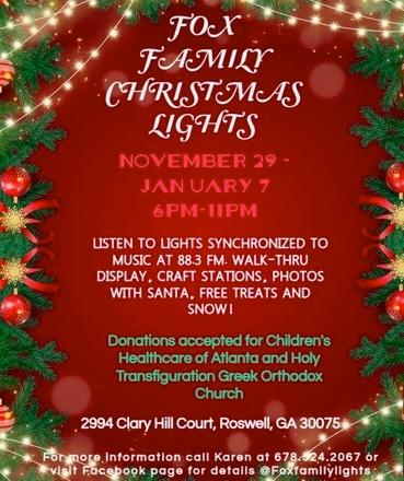 HTGOC member Karen Fox hosts an outdoor Christmas display at her home with thousands of lights synchronized to music. Live Santa and Mrs. Claus visit on select dates for photo ops and treats. The first Santa visit is on Sunday, December 7th at 6:30pm. Our Santa speaks Greek! Check Facebook page for details, @Foxfamilylights. Donations are accepted for our church in addition to Children’s Healthcare of Atlanta.