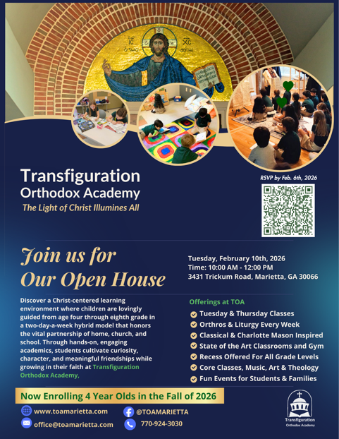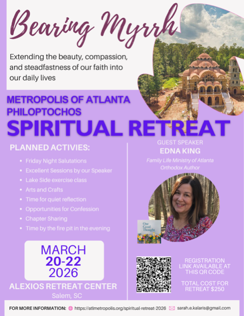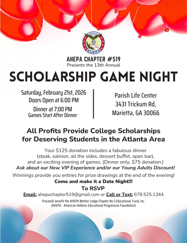 | | SAVE THE DATE FOR AHEPA GAME NIGHT: FEB. 21 | | 13th Annual AHEPA Chapter #519 Scholarship Game Night: AHEPA #519’s 13th Annual Scholarship Game Night will be held on Saturday, February 21st, 2026 in the PLC. In the past twelve years, this event has raised over $56,000 and helped provide over 117 College scholarships for deserving men and women in the Marietta area. This annual event promises a fabulous dinner and an exciting evening of games and prizes for everyone. Make it a Date Night! Please see the Scholarship Game Night Flyer (below) for information on how to RSVP for the event, and feel free to forward it to family and friends, and/or visit our website (ahepa519.info) for more information. You can also RSVP / pay for the event, and/or purchase tickets for 50/50 Drawing on Sundays in the PLC after the Divine Liturgy, starting January 18th, 2026. Finally, if you are unable to attend the Scholarship Game Night, and would like to donate to the Scholarship Fund, please contact Ron Sprouse at 404.408.7875 or via email at: ron@ronsprouse.com. | | METROPOLIS PHILOPTOCHOS RETREAT: MARCH 20-22 | | RECURRING MINISTRY EVENTS | | Our next meeting will be Wednesday, February 4 at 10:00 am in Lower Level Parish Hall Classroom #127. Please text Ann Zakreski at 770.329.7421 if you plan to come. | | LIFE & FAITH TRANSITIONS GROUP | | | | |