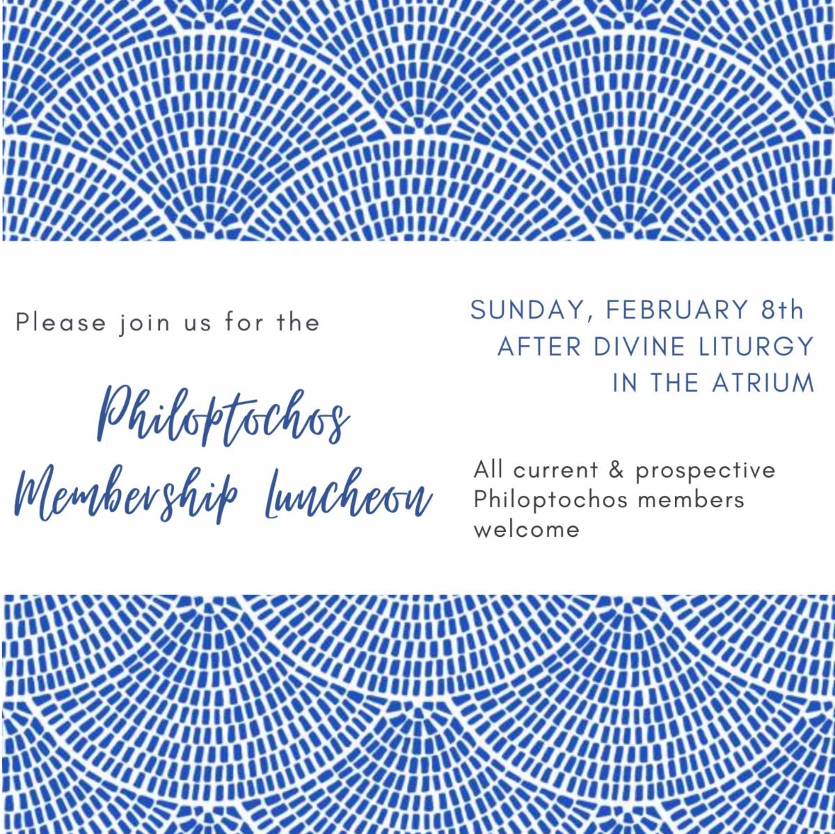 | | PHILOPTOCHOS UPCOMING EVENTS | | Sunday, February 8: Membership Luncheon/General Meeting following Divine Liturgy | | |