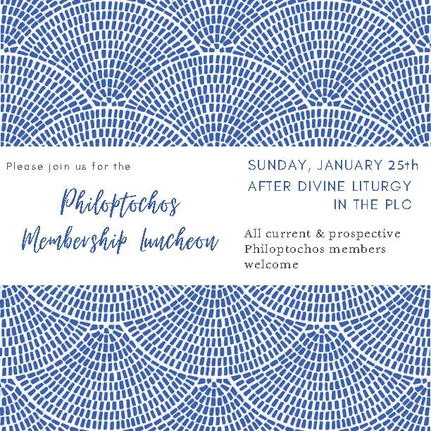 | | PHILOPTOCHOS UPCOMING EVENTS | | Sunday, January 25: Membership Luncheon/General Meeting following Divine Liturgy | | |