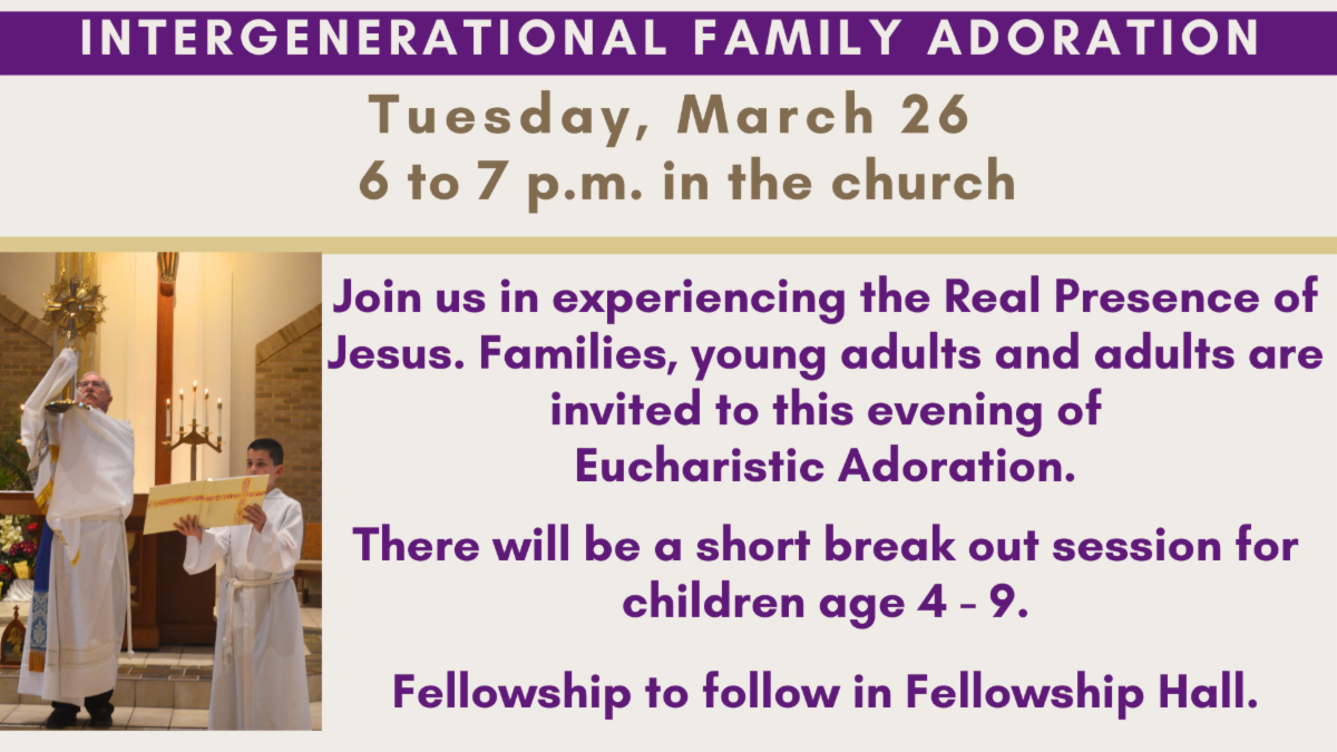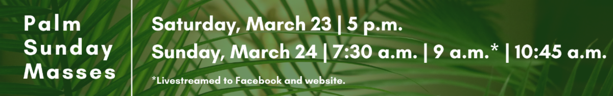 In addition to our Holy Week opportunities, please also remember our regular parish schedules of Mass, Eucharistic Adoration, and Confession (last Lenten Confession is on Saturday, March 23 at 4 p.m.).