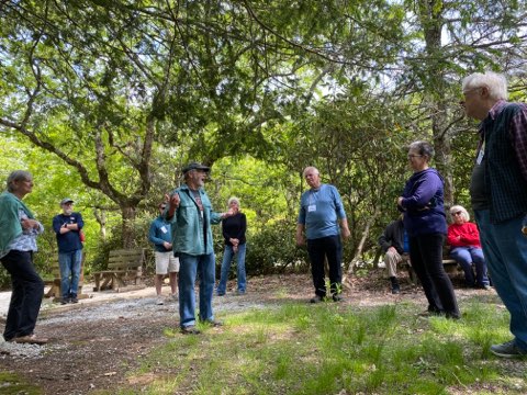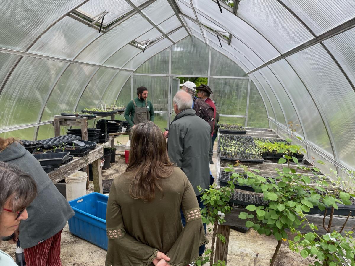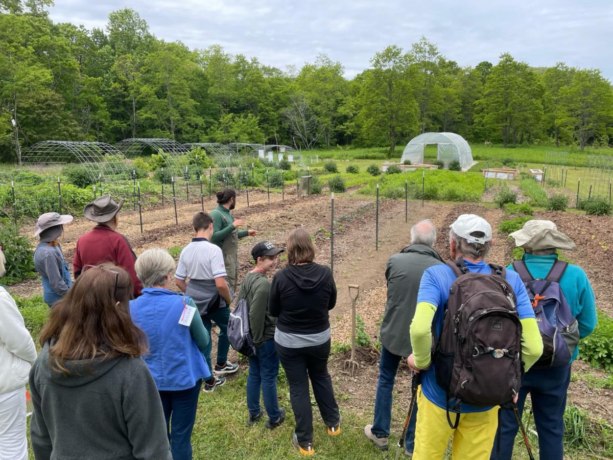 Tolvin Stiles, Farm Manager, shows new crops, moving of the hoop house, the garden plot for kitchen produce, and new plants for the food forest (provided by a Laurel Garden Club grant).