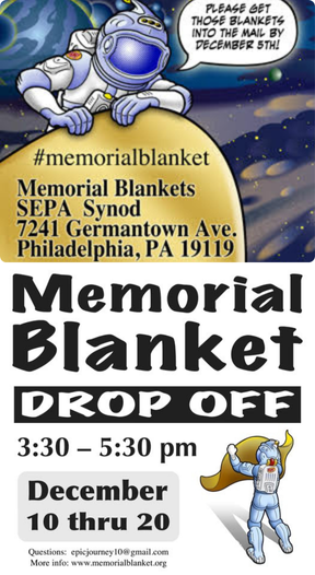 Blankets arriving at this address will be lovingly cared for by our good friends at the Southeastern Pennsylvania Synod in Philadelphia, then added to the display at Independence Hall on December 21st.