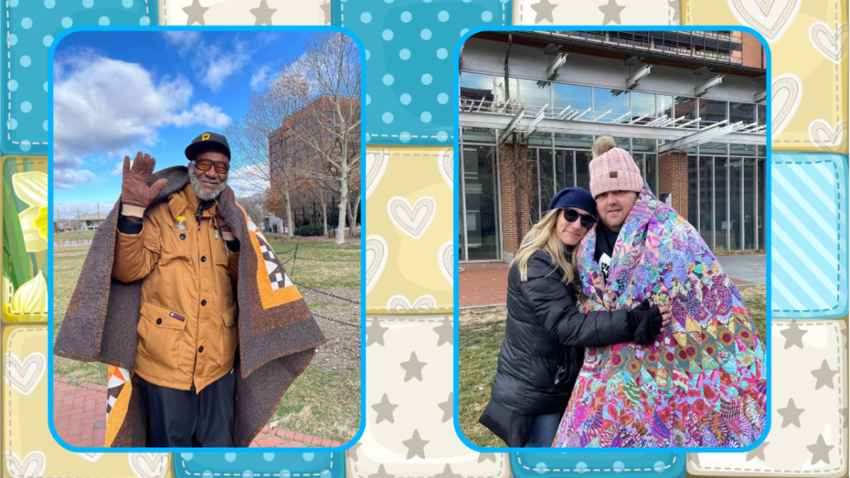 While volunteers experienced glimpses of the cruelty of the elements, they had access to relief often denied to the unhoused, such as restrooms or a warm place to rest. They also found satisfaction in knowing that nearly 1,000 handmade blankets would soon be in the hands of unhoused individuals in Philadelphia. Some, like those pictured, even gained relief during the event itself!