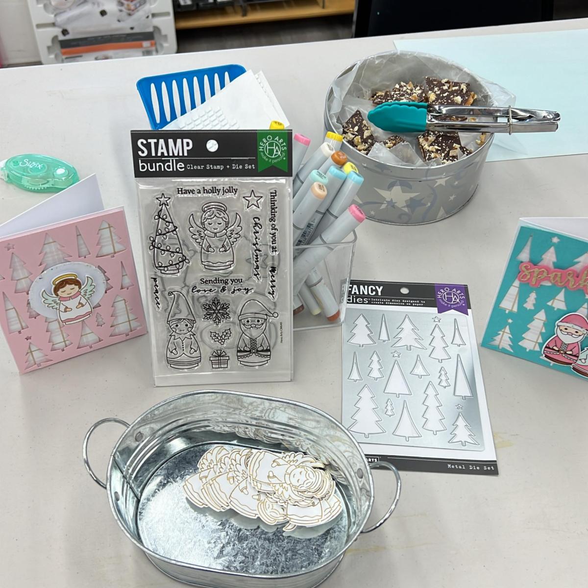 Join us to make 3 wonderful cards/tags using dies, paper, stamps, glitter and more. We provide all the supplies and a lot of holiday cheer! As in years past there will be festive projects, cookies, special buys and maybe a few surprises, too!