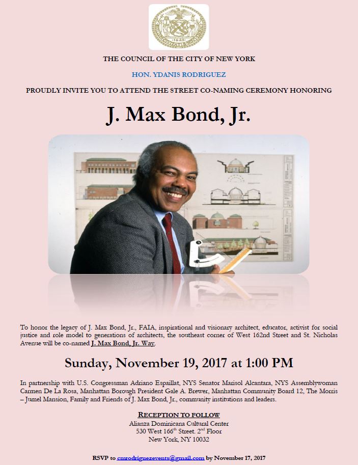 NORTHERN MANHATTAN COMMUNITY TO HONOR j. mAX bOND jR., Visionary architect, educator, and activist for social justice BY UNVEILING