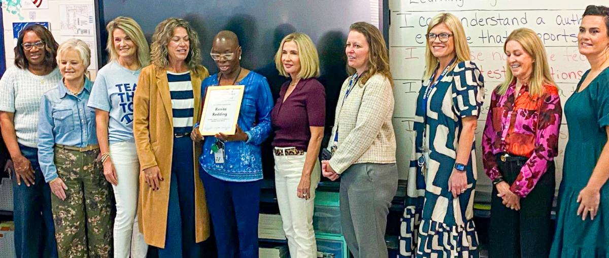 | | Renita Redding of Northside Elementary School, at center holding certificate, was one of nine Tift County teachers surprised in their classrooms last week with an Excellence in Teaching Award designation from the Tift County Foundation for Educational Excellence. School officials, Foundation representatives, friends, and family members are among those who gathered for the surprise presentations. | | HONORING TIFT'S TOP TEACHERS | | |