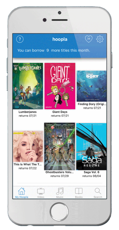 Hoopla is a groundbreaking digital media service that allows you to borrow movies, music, audiobooks, ebooks, comics and TV shows to enjoy on your computer, tablet, or phone - and even your TV! With no waiting, titles can be streamed immediately, or downloaded to phones or tablets for offline enjoyment later. We have hundreds of thousands of titles to choose from, with more being added daily. hoopla is like having your public library at your fingertips. Anytime. Anywhere.