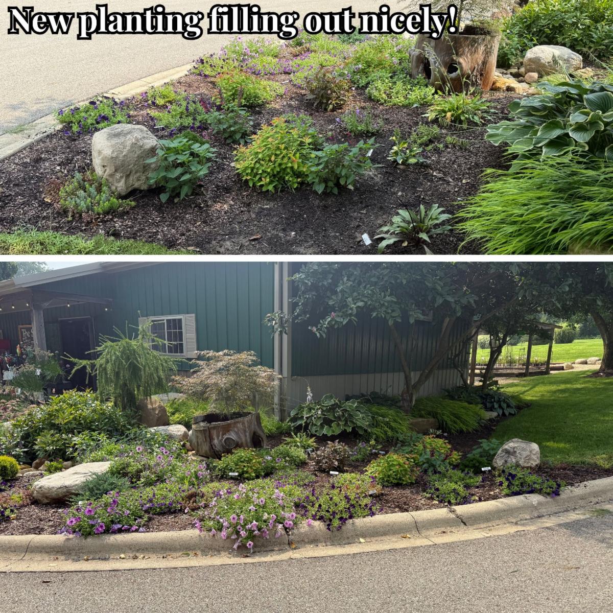 | | On site, our crew installed a new planting to the west of "The Shop." Right across from our retail checkout and along the drive into the garden center, the planting has filled out nicely by the end of July. Look right too see this planting when you drive into the garden center this fall. | | |