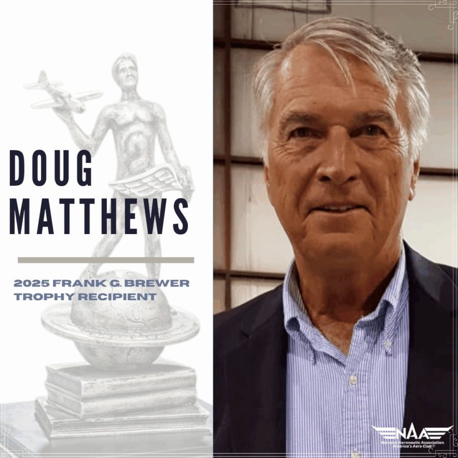 The National Aeronautic Association (NAA) announced that Doug Matthews has been selected as the 2025 recipient of the Frank G. Brewer Trophy. The Brewer Trophy, established in 1943, honors significant contributions of enduring value to aerospace education in the United States and is housed at the National Air & Space Museum in Washington, D.C. Past recipients of the Brewer Trophy include Edward Stimpson, Peggy Chabrian, the National Air and Space Museum’s docent corps, the NASA Spacelink Team, Barrington Irving, and the 2024 recipient, Glendon Fraser.