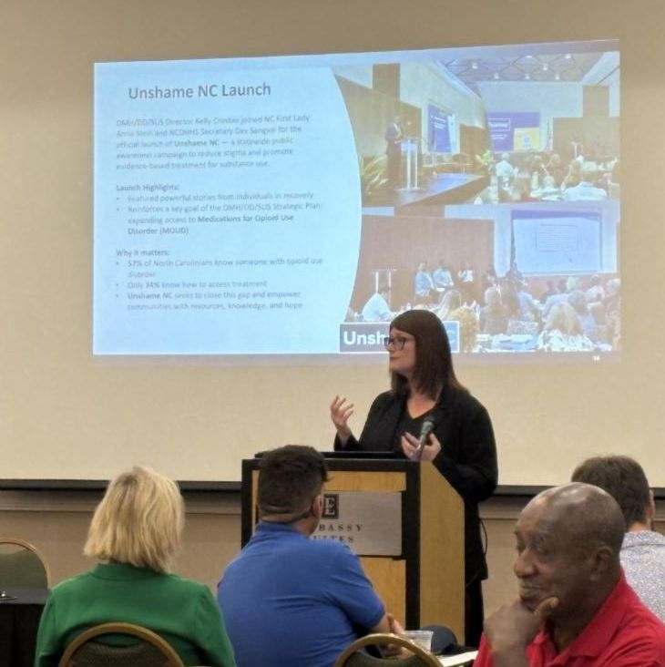 Director Crosbie shared progress in making Medicines for Opioid Use Disorder (MOUD) available to more people in all parts of the state. She spotlighted Unshame NC, a public education campaign aimed at reducing stigma by sharing real stories from individuals impacted by OUD.