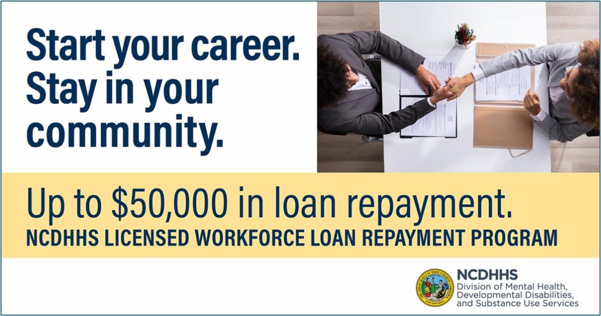 Earlier this month NCDHHS announced the launch of the Licensed Workforce Loan Repayment Program, a $20 million initiative to recruit and retain licensed professionals who provide mental health, substance use, intellectual and developmental disabilities (I/DD), and traumatic brain injury (TBI) services in rural and underserved communities.