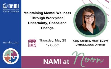 Join the National Alliance on Mental Illness-North Carolina for an important, insightful conversation with Kelly Crosbie, Director of the NC Division for Mental Health, Developmental Disabilities and Substance Use Disorders. We’ll discuss how managers and executives can set a positive and empathetic tone during times of stress, steps employers can take to ease difficult transitions, and how employees can protect and care for their own mental wellness.