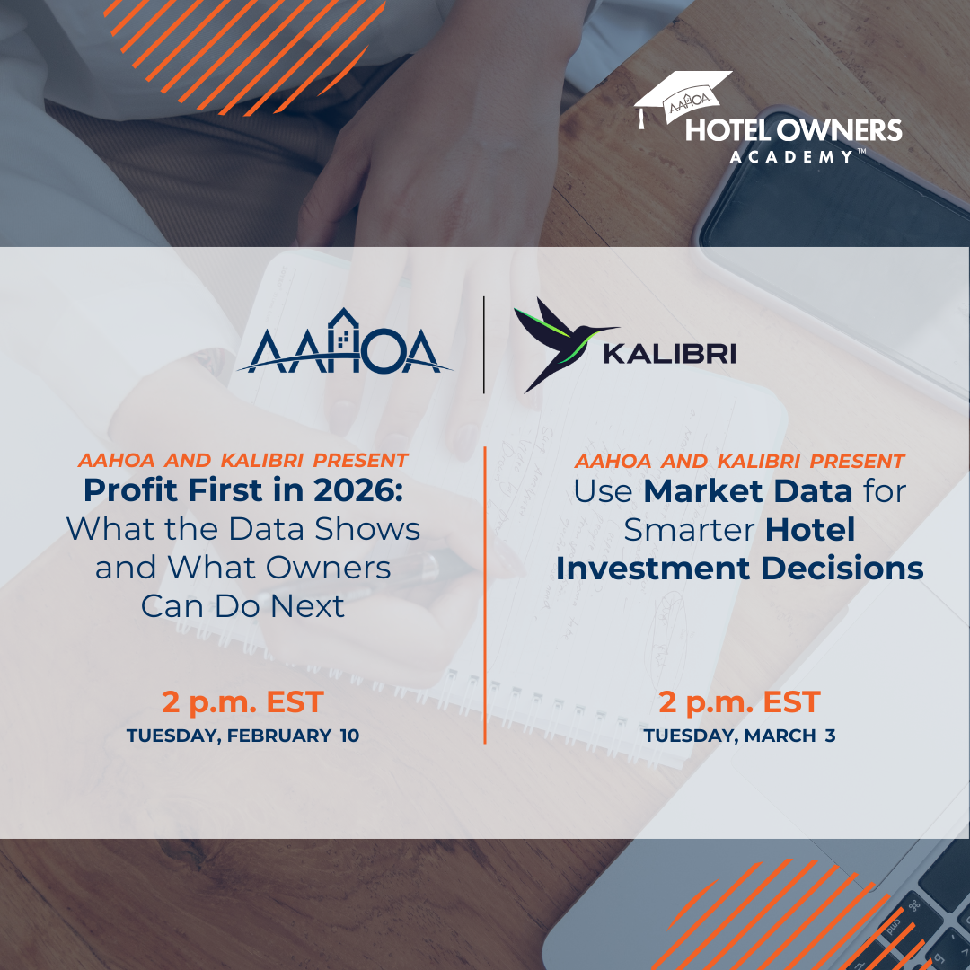 AAHOA and Kalibri are hosting two virtual sessions with Jennifer Hill, SVP of Commercial Strategy at Kalibri, exploring hotel performance trends and market data.