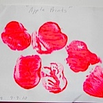 Make apple prints! All you need is a one ripe apple, finger paint in a bright color like red, and a sheet of white paper or cardstock. Cut the apple in half from the stem. Pour or spoon the finger paint on a plate. Help your child hold the apple, using hand under hand. Dip the apple half into the paint and press it to the paper. Try making a few more prints. Then let the prints dry.