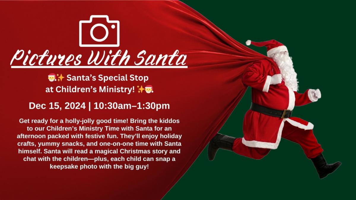 Children's Ministry time with Santa. Children will have crafts, snacks and time with Santa. Santa will read a story and visit with the children. The children will have the opportunity to take a picture with Santa. Then after, Santa will be available to take photos with everyone that attended service. Registration is preferred but not necessary.