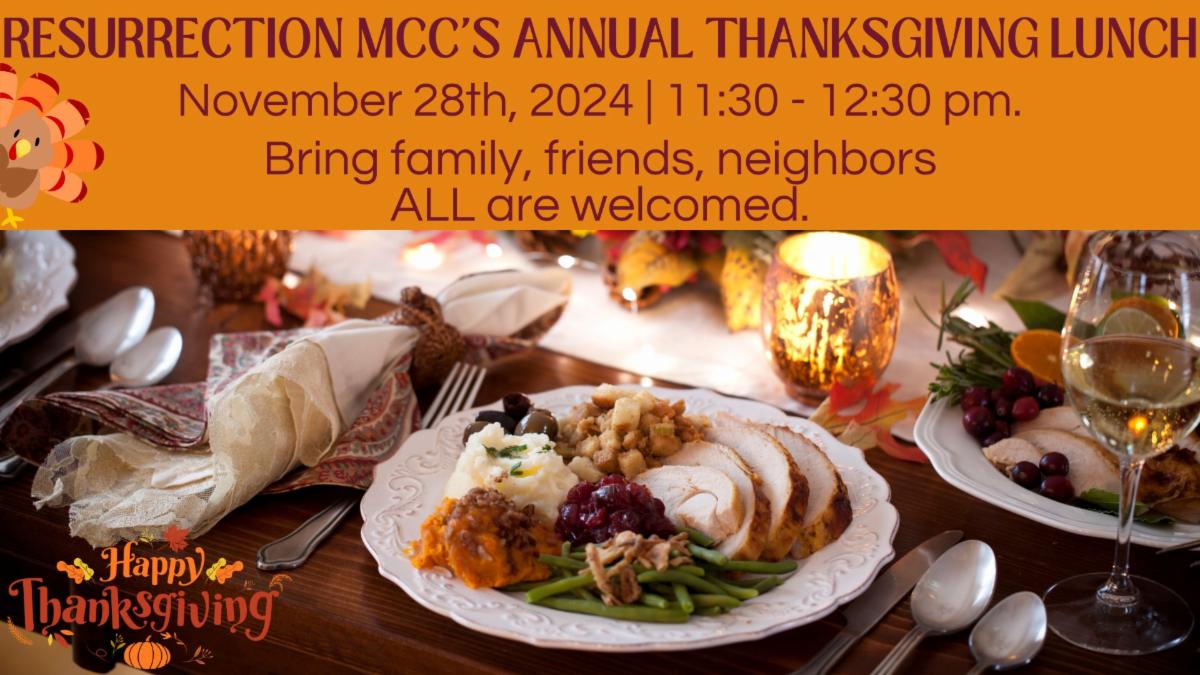 Join Resurrection MCC's Annual Thanksgiving Lunch from 11:30 - 12:30 pm.