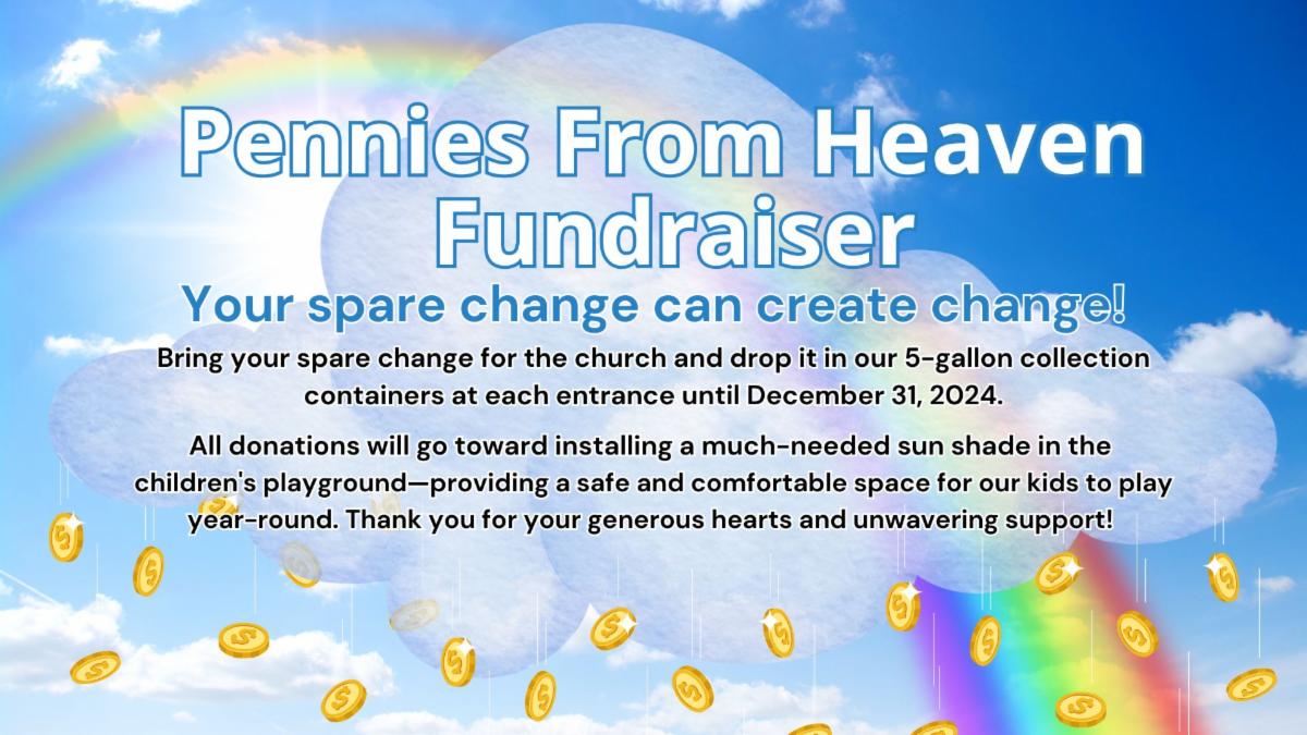 Your spare change can create change! Bring your spare change for the church and drop it in our 5-gallon collection containers at each entrance until December 31, 2024.