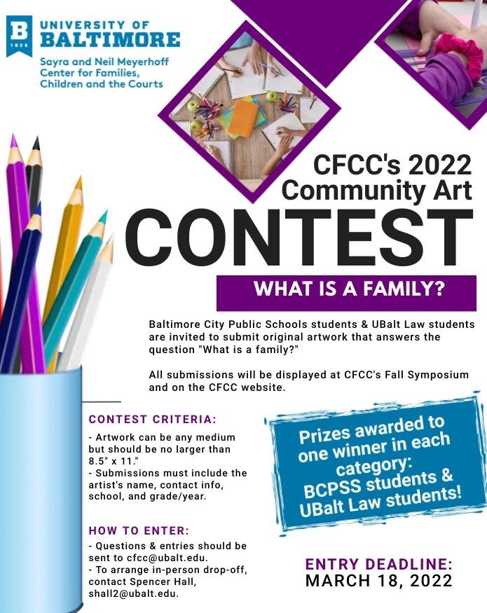 Baltimore City Public School students and members of the University of Baltimore Law School community are invited to submit original artwork for CFCC’s inaugural Community Art Contest. All submitted artwork will be featured in a virtual gallery on CFCC’s website and displayed at CFCC’s Fall Symposium. Prizes will be awarded to one winner in each category – BCPS students and UBalt law students. Check out our CFCC blog for details.
