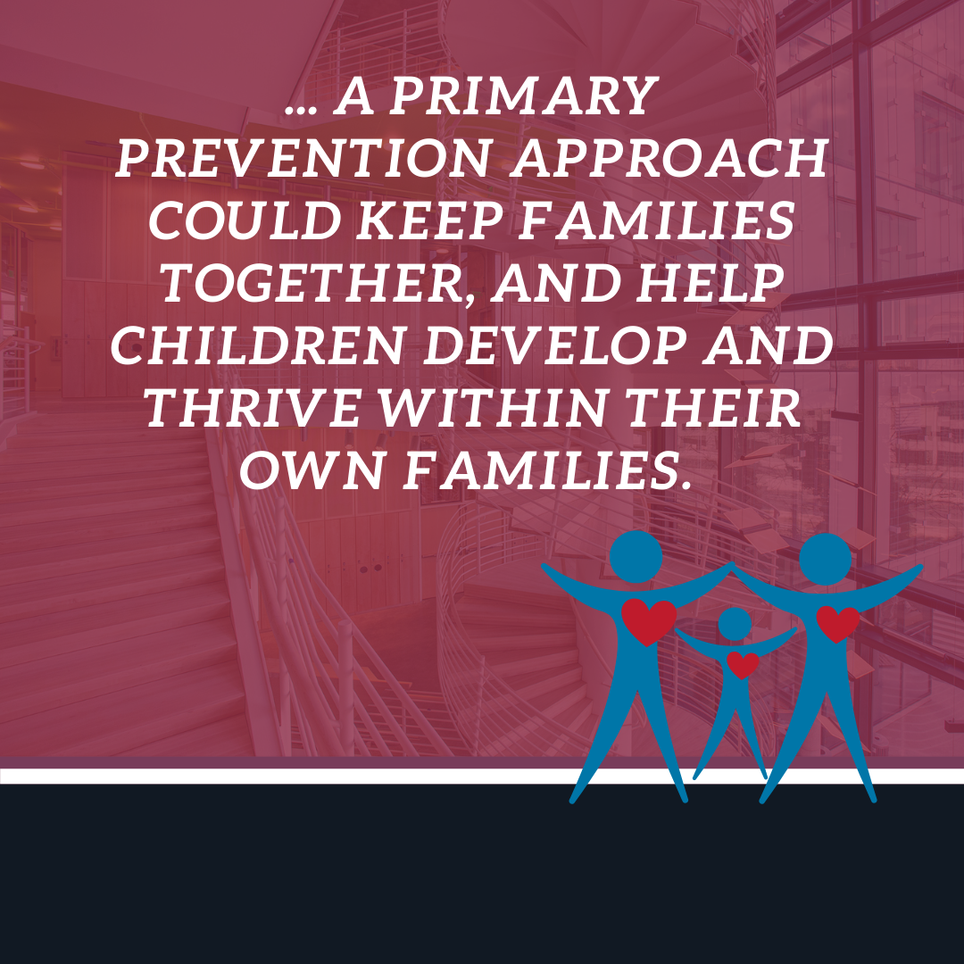 The child welfare system typically approaches both abuse and neglect by intervening after a family is already in crisis rather than trying to address the core reasons that can lead to child welfare intervention. For families to experience meaningful change, and for children to be healthy and safe, our system needs to shift its focus from belated, crisis-driven responses to a focus on primary prevention.