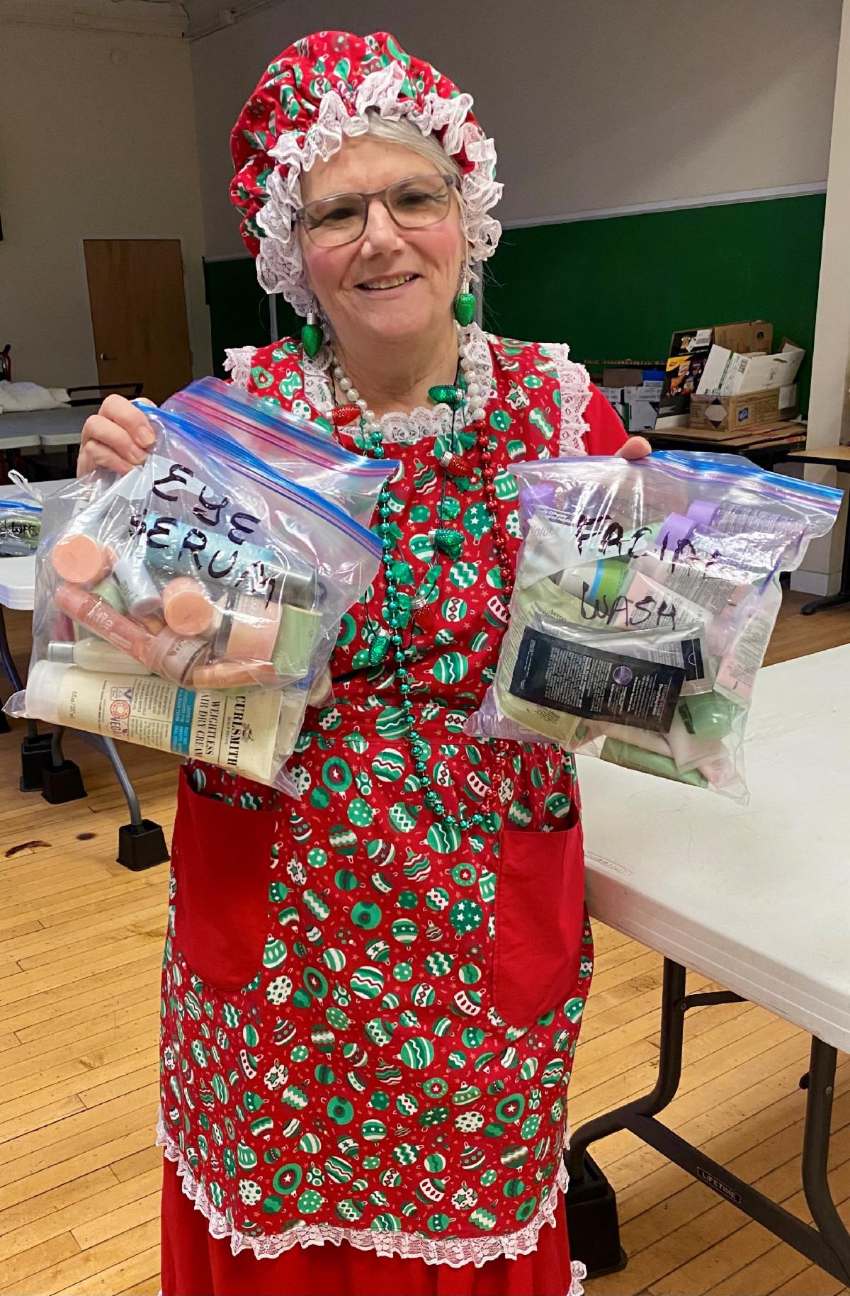 Marge Harman (shown in the accompanying photo), brought these donations to Holy Family a few days before Christmas, after volunteering as “Mrs. Claus” at another local non-profit organization. Shares Marge: “Our Women of Grace group had heard about the need for these kinds of items at the Closet Door and we were very happy to help out. Part of the Women of Grace’s mission is to come into a closer relationship with Jesus and his Blessed Mother, and we thought that collecting and making this donation for homeless women fits quite nicely with this mission.”