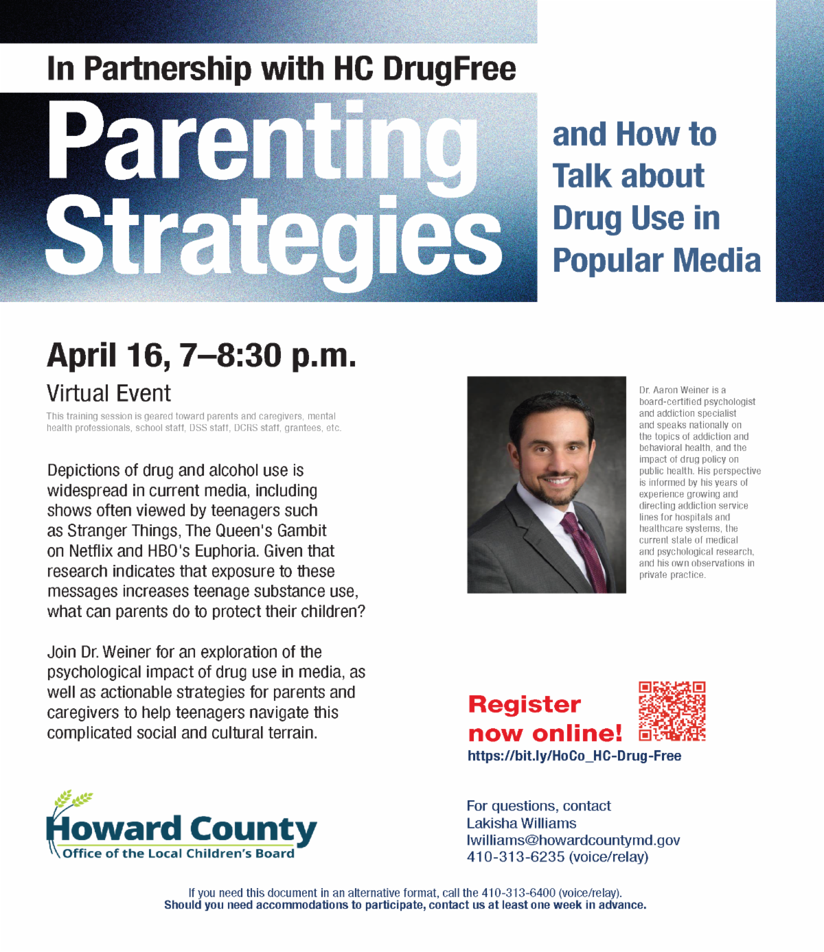 The Office of the Local Children's Board, in partnership with HC DrugFree, is pleased to share the Parenting Strategies virtual event. Join Dr. Aaron Weiner for an exploration of the psychological impact of drug use in media, as well as actionable strategies for parents and caregivers to help teenagers navigate this complicated social and cultural terrain.