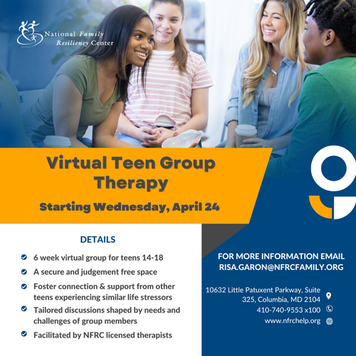 The National Family Resiliency Center (NFRC) will be hosting Virtual Teen Group therapy in April. Facilitated by two NFRC-licensed therapists, this teen group will provide a safe place, where teens meet for 6 weeks to foster connection and support from other teens experiencing similar life stressors.