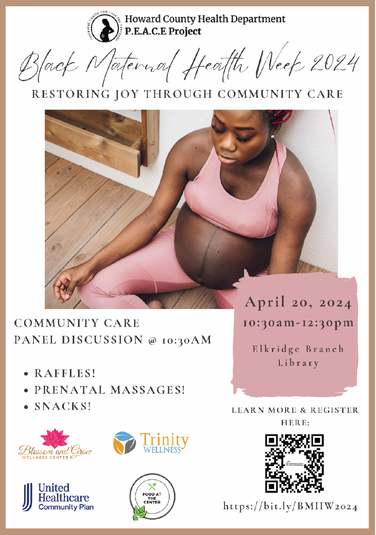 The Howard County Health Department, in partnership with the Local Health Improvement Coalition, is hosting a discussion and resource sharing session in honor of Black Maternal Health Week. The focus this year is on restoring Joy through Community Care. Join us for conversation, education, resources, and other joy-filled activities!