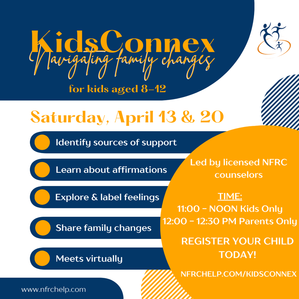 The National Family Resiliency Center will be hosting their KidsConnex event in April. KidsConnex is a two-session, online program for children ages 8-12, experiencing family transitions, specifically, the separation and/or divorce of their parents.