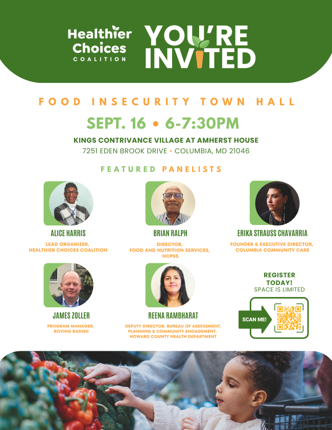 The Healthier Choices Coalition, Howard County Public School System (HCPSS), and community partners invite you to a dynamic town hall addressing food insecurity in Howard County. Residents, leaders, and organizations will explore solutions to improve access to healthy food.