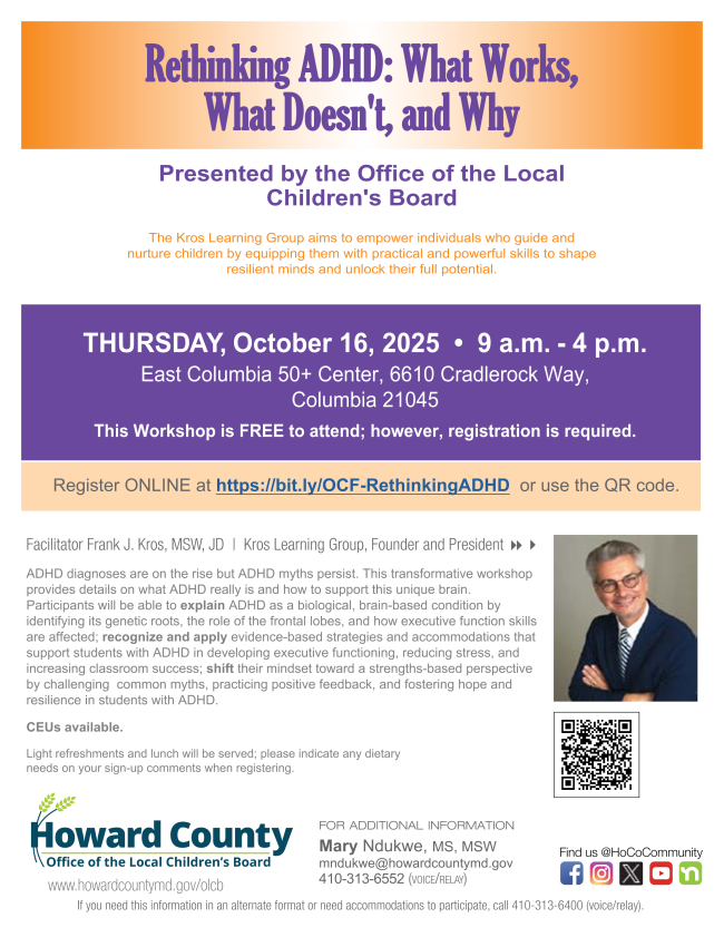 Howard County Local Children’s Board is excited to invite you to an upcoming event focused on Attention-deficit/hyperactivity disorder (ADHD). This engaging and informative workshop explores the science behind ADHD and offers practical tools for supporting neurodiverse learners. Lunch and light refreshments will be provided. If you have any dietary restrictions, please let us know when registering.