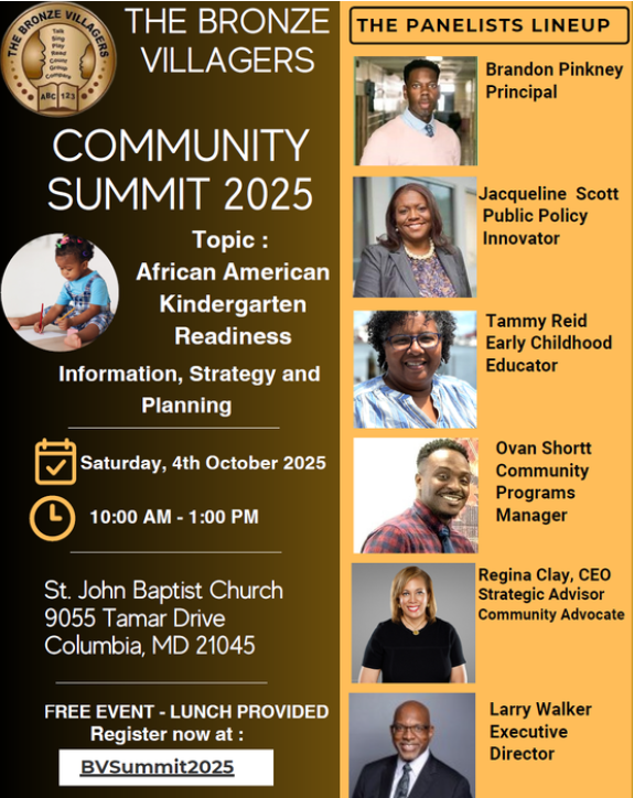 The Broonze Villagers Community Summit is to bring the African American community together to brainstrom ideas to galivanize, mobilize and empower the African American community to make a critical mindset shift to early learning for infants, toddlers, and preschoolers to increase kindergarten readiness. Lunch will be provided.