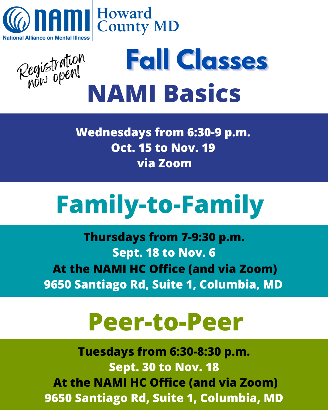 Register is now open for the National Alliance of Mental Illness (NAMI) of Howard County's free fall classes!
