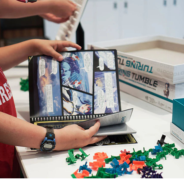 Students build marble-powered, mechanical computers to solve a series of structured logic puzzles, using their own hands instead of a screen. It looks like a fun marble run, has an engaging graphic novel woven through the puzzle book, and is the first STEM curriculum solution that allows students to grasp the fundamentals of how a computer works by hearing, seeing, feeling, and programming a mechanical computer.