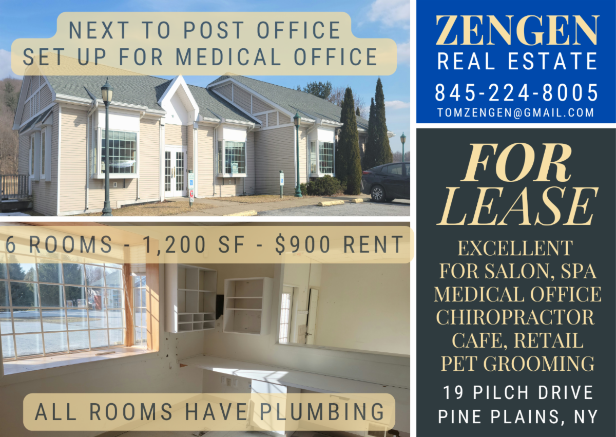 PINE PLAINS/RT 82 LOCATION Behind Post Office, next to Stewarts Gas Station. Newly remodeled space with full hood system, walk in cooler and 3 bay sink in place from former restaurant. Would make excellent ice cream shop, café, bagel, bakery, salon, boutique, gallery, office, etc. New sheetrock, drop ceiling & flooring. Beautiful double French door entrance with double large bay windows. Customer bathroom. Call today and start your business dream in lovely Pine Plains community with popular outdoor recreational attractions: Stissing Mountain Fire Tower, Stissing Lake, Hiking Trails, Rec Beach, Pavilions, Ball Fields, etc. Long term lease. ID23PINEPLAINS