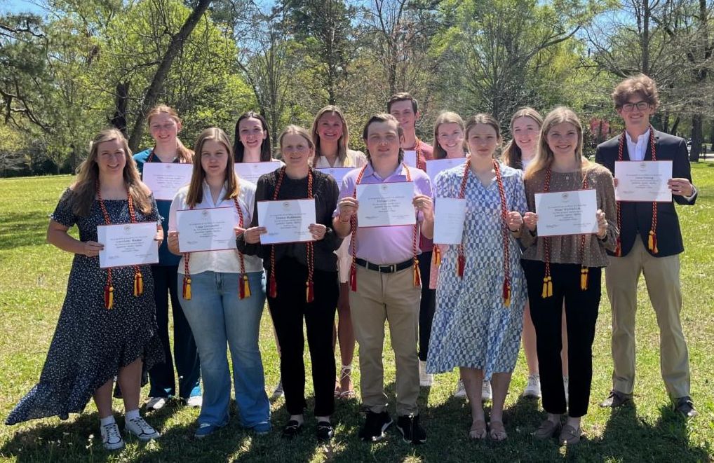 HUNTINGDON ESTABLISHES CHAPTER OF ALPHA ALPHA ALPHA | On Monday, 26 Huntingdon students were the inaugural inductees into Huntingdon's newly established Iota Mu chapter of Alpha Alpha Alpha. Tri Alpha was founded in 2018 at Moravian University in Pennsylvania to celebrate the academic achievement of first generation collegians. Successful completion of 30 credit hours and a cumulative grade point average of 3.2 makes students eligible for induction. Congratulations to these Hawks! | The inaugural officers of the Iota Mu chapter of Alpha Alpha Alpha are from left to right: Secretary Emma Grace Samples '27 of Gadsden, Alabama; Vice President Karlie Honeycutt '25 of Niceville, Florida; President Richie Hicks '25 of Wetumpka, Alabama; Historian Madison Salzman '25 of Midlothian, Virginia; and Treasurer Montanna Mitchell '25 of Montgomery, Alabama. | |