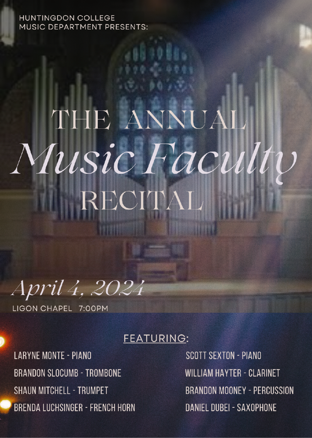 April is full of vocal and instrumental concerts performed by individual students and Huntingdon ensembles. A complete schedule of upcoming music events can be found here. | |