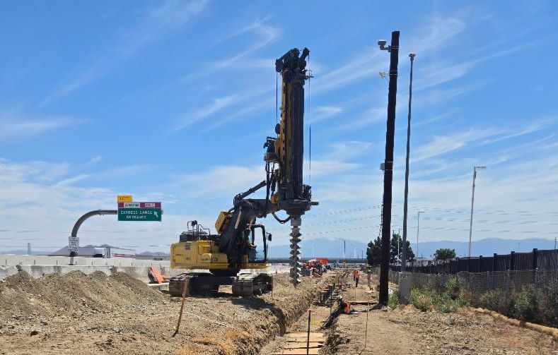 Construction activities continue along the I-15 corridor, including sound wall and retaining wall construction, bridge reconstruction, and other improvements to support a wider freeway footprint. Concrete barriers (k-rail) remain in place along freeway shoulders to create safe work zones.