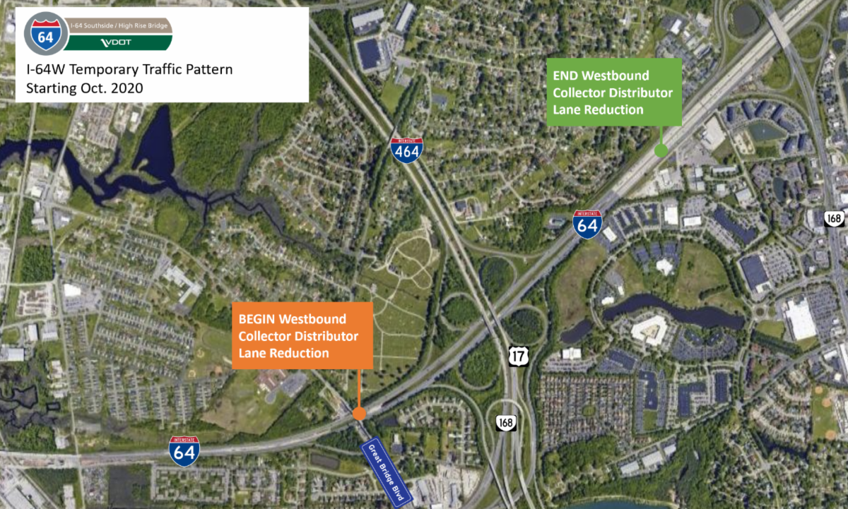 Motorists traveling on I-64 west (towards Virginia Beach) should anticipate a new, temporary traffic pattern near the Great Bridge Boulevard overpass at the start of the collector-distributor road (outside lanes) beginning as early as Oct. 13.
