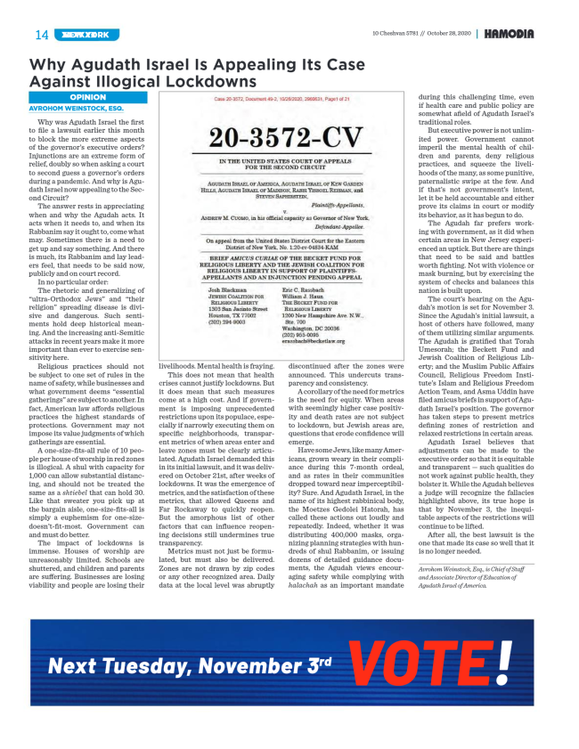 We look forward to working with the yeshiva community and the governor’s office to help implement this plan to reopen our precious yeshivos. And as rates of infection in our neighborhoods continue to decline, we look forward for other parts of our community to safely reopen.