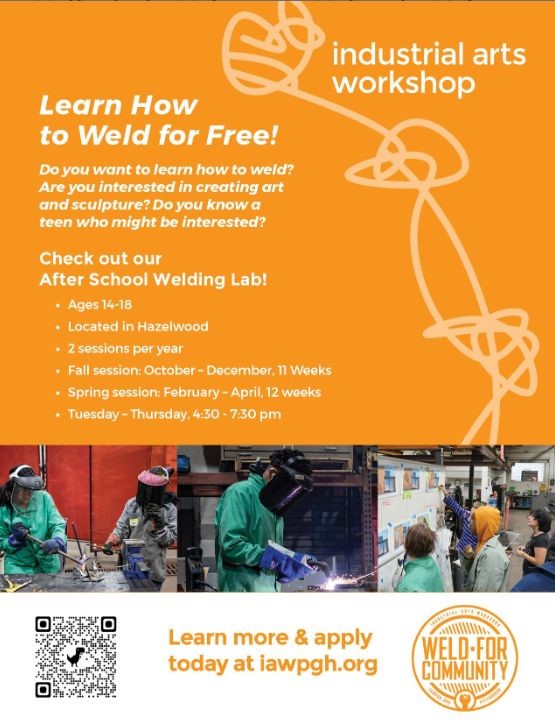 The Industrial Arts Workshop (IAW) in Hazelwood offers a one-of-a-kind After-School Welding Lab for Pittsburgh-area youth ages 14 to 18. This innovative program combines the art of welding with creative sculpture design to empower students with skills in art, community development, and workforce readiness.