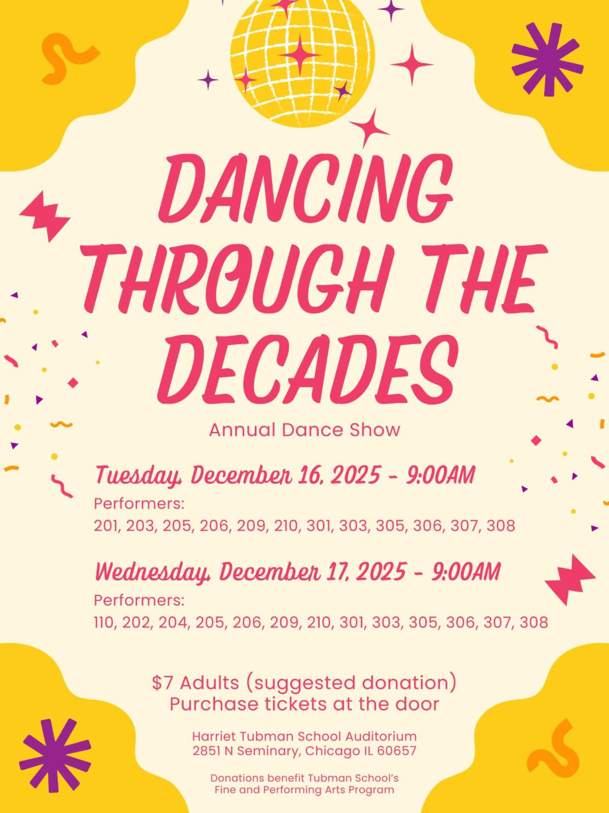 Tuesday, December 16th | 9AM | Dance Show: "Dancing Through the Decades" - Performers: 201, 203, 205, 206, 209, 210, 301, 303, 305, 306, 307, 308