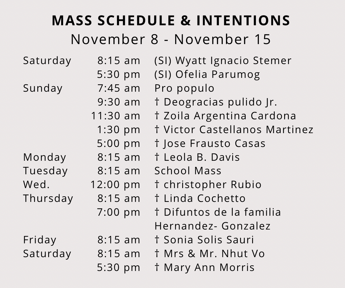 Join us for the Latino Food sale this Sunday, November 9 from 9:00 a.m. to 3:00 p.m., and enjoy a delicious meal with your family. Thank you in advance for your generous support! | | | |