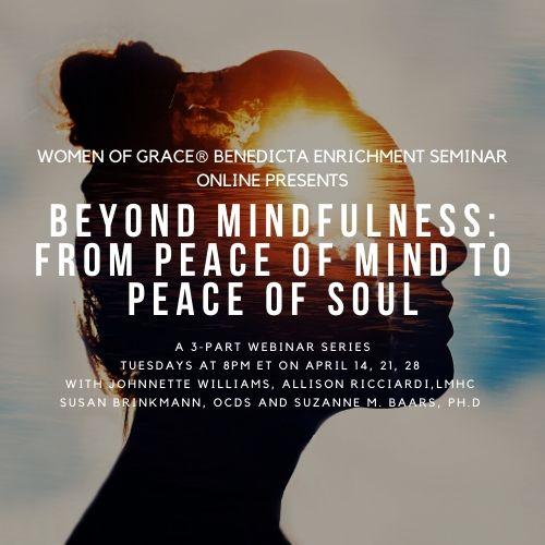 We're so grateful you have registered for our Women of Grace Benedicta Leadership Webinar "Beyond Mindfulness: From Peace of Mind to Peace of Soul," a 3-Part Webinar Series with Johnnette Williams, Allison Ricciardi, LMHC, Susan Brinkmann, OCDS and Suzanne M. Baars, Ph.D.