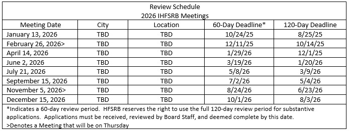 All correspondence must be received through HFSRB’s official email address (dph.hfsrb@illinois.gov). Correspondence submitted through other emails will not be considered received and will not be processed or reviewed.