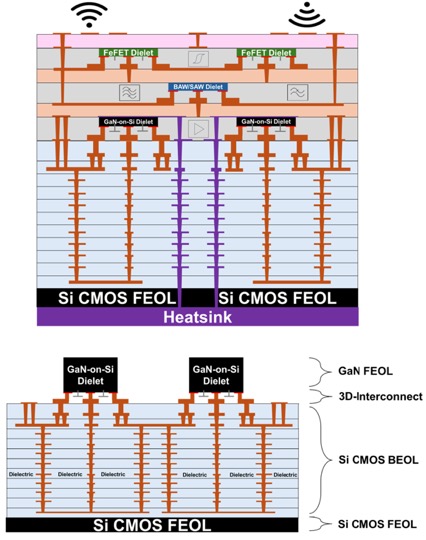 | | 3-D-Millimeter Wave Integrated Circuits (3D-mmWIC) Using GaN-on-Si Dielets With Si CMOS for 5G FR2 Power Amplifiers | This work details the development of a 3-D-millimeter wave integrated circuit (3D-mmWIC) platform for the integration of highly scaled gallium nitride (GaN) dielets with Si CMOS for the fabrication of high-frequency circuits and systems. Au-free AlGaN/GaN-on-Si high-electron mobility transistors (HEMTs) with Lg=80nm are fabricated and singulated to a size of 240×410μm2 for the fabrication of the dielet front-end-of-line (FEOL). The dielets are integrated with an Intel 16 Si CMOS back-end-of-line (BEOL) using a solder-free, direct Cu–Cu thermocompression bonding (TCB) process. The developed process is used for the demonstration of several power amplifiers (PAs) targeting the fifth-generation (5G) new radio (NR) frequency range 2 (FR2) bands. Large signal characterization is completed with testing under 64, 256, and 1024-quadrature amplitude modulation (QAM) schemes. | | | |