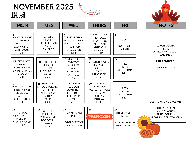 | | All Soul's Day Memorial Prayer Wall | | There is still time if you'd like to send in photos of your loved ones to be displayed on our All Soul's Memorial prayer wall. Send in your photos to attn: Mrs. Dunlap in the school office or email it to ldunlap@ihmschoolgr.org | |